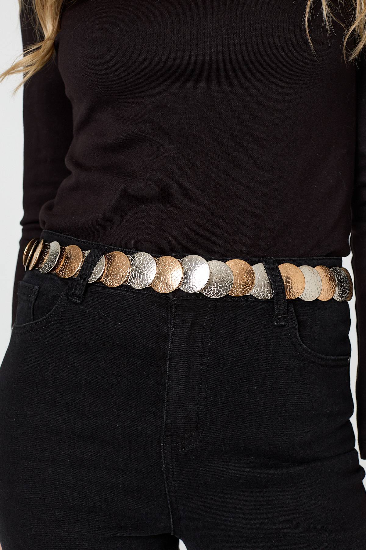 Add a metallic shine to your evening outfit with this medallion belt. It features two contrast-tone colours, with an intricate design and textured coin details. Style through belt loops on your trousers, or leave loose over a floaty midi skirt.
