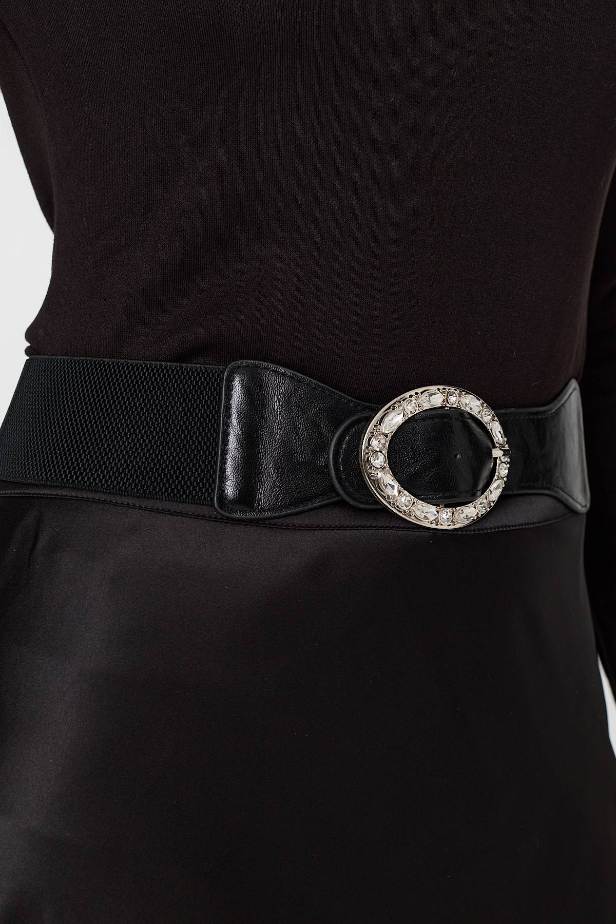 This statement belt features beautiful sparkly diamante details around the buckle, as well as faux leather materials. Thanks to a wide shape, you can wear this belt around your waist over a jumper or a dress for a statement evening look.