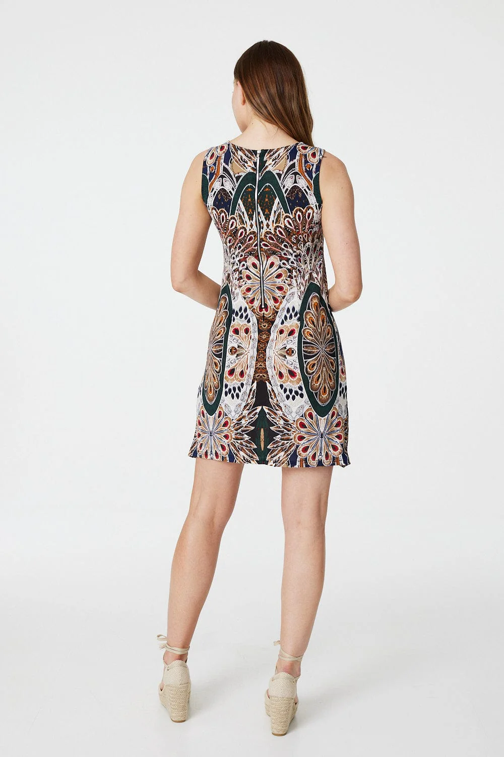 Add a new print to your new season collection with this peacock print shift dress. It has a round neck, a sleeveless fit that's still bra-friendly and a short skirt. It features a zip back closure. Wear with heeled wedges and a linen blazer for a chic daytime look.