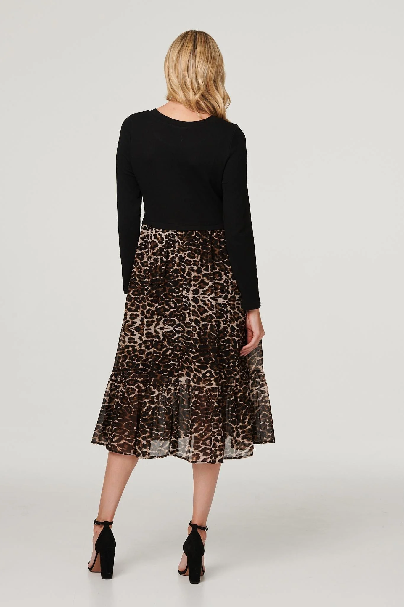 A bold leopard print dress is a great addition to a capsule wardrobe. Like this one with a soft jersey body, a round neck, long sleeves and a printed chiffon tiered midi skirt. Team with neutral heels for an elegant style that's both classic and timeless.