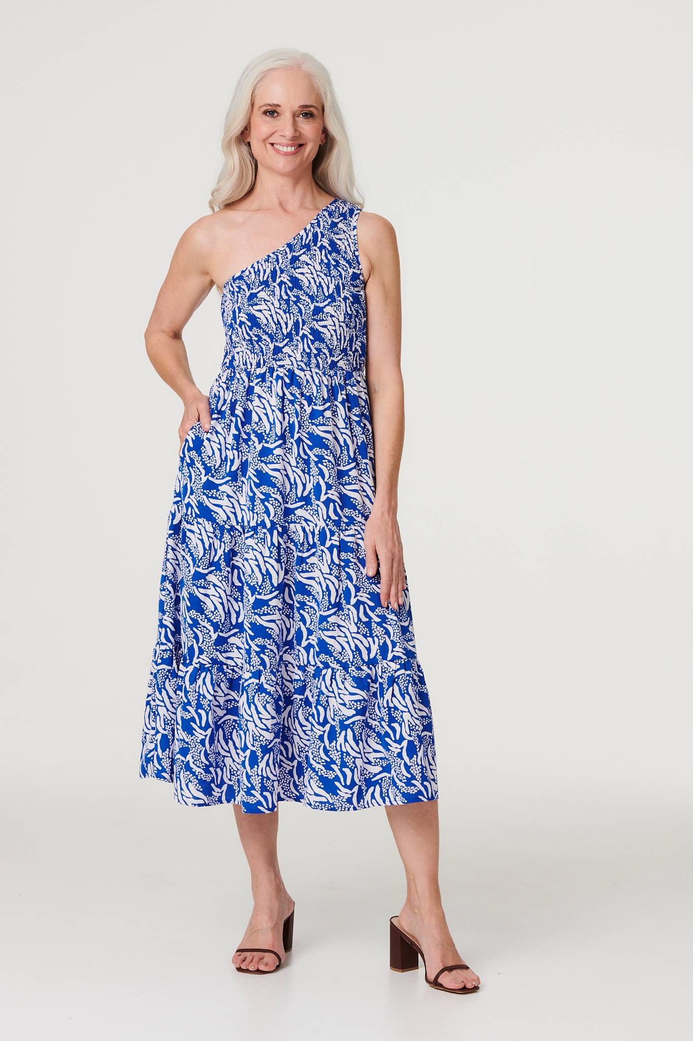 Work on your tan in this one-shoulder asymmetric dress. It has a sleeveless shirred bodice, one shoulder neckline, hidden pockets and a midi length hem. It's just as perfect for a summer day on holiday as it is a romantic evening dinner.