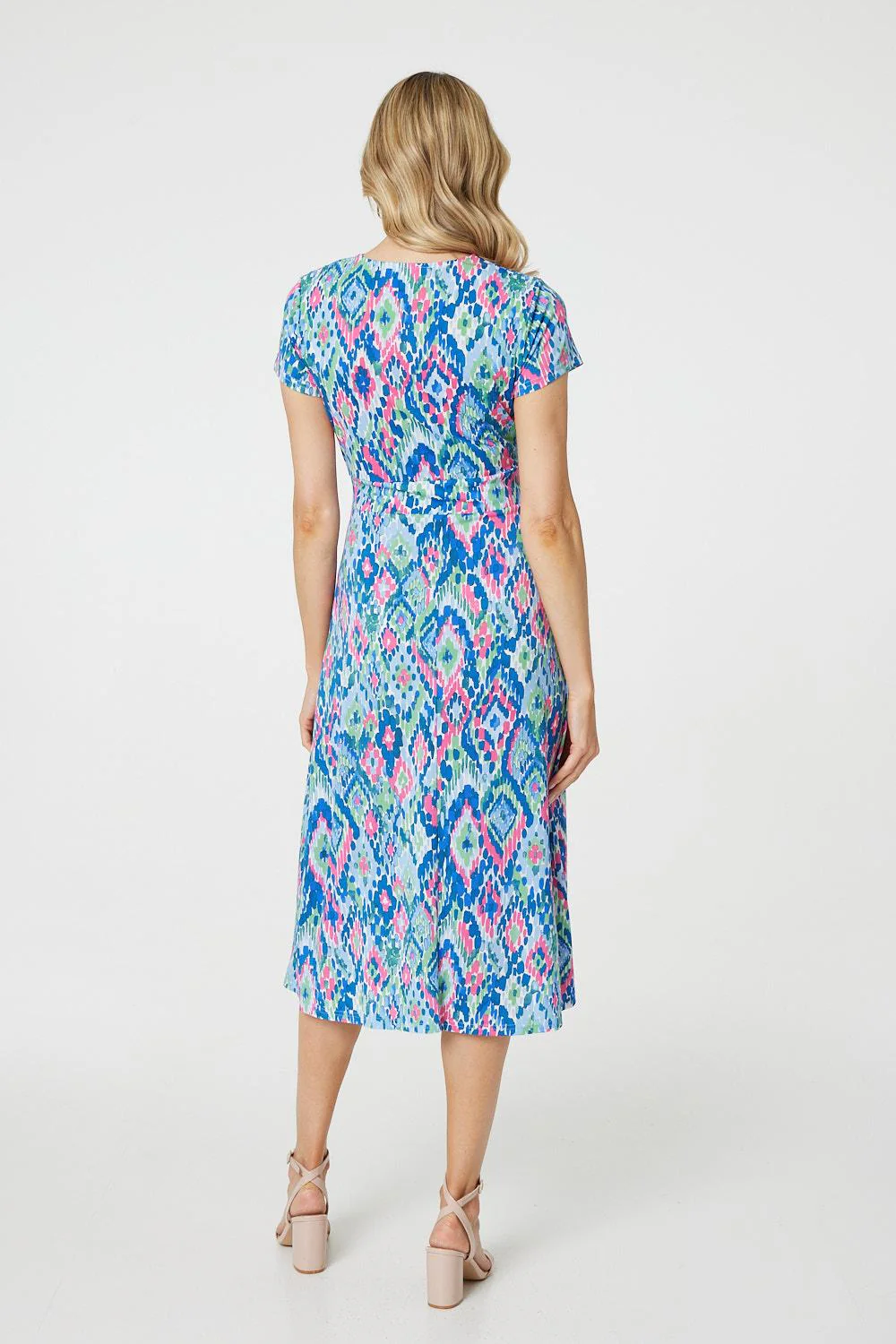 You can't go wrong with a classic midi dress. This one has a faux wrap front, as well as a ruched panel on the waist that will flatter your figure. Stay cool with short sleeves and a midi length hem. Pair this dress with heels for a formal event, or dress it down with white trainers.