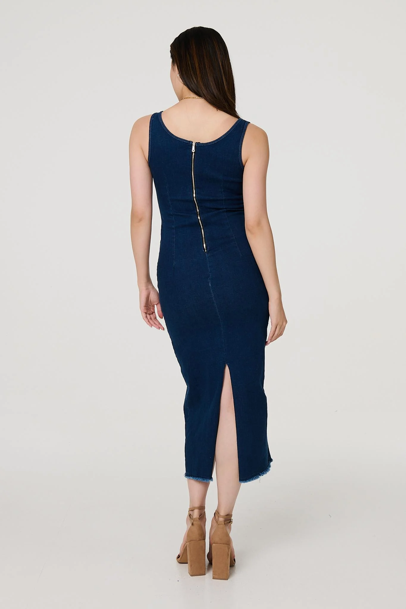 Make a stylish statement in this elegant denim midi dress. With a square neckline, wide cami straps, curve enhancing contoured front seams, a zip back, a split back detail and a raw hem sitting below the knee. Elevate with metallic heels for a dinner date with the girls or dress down with strappy sandals and a cross body bag during the day.