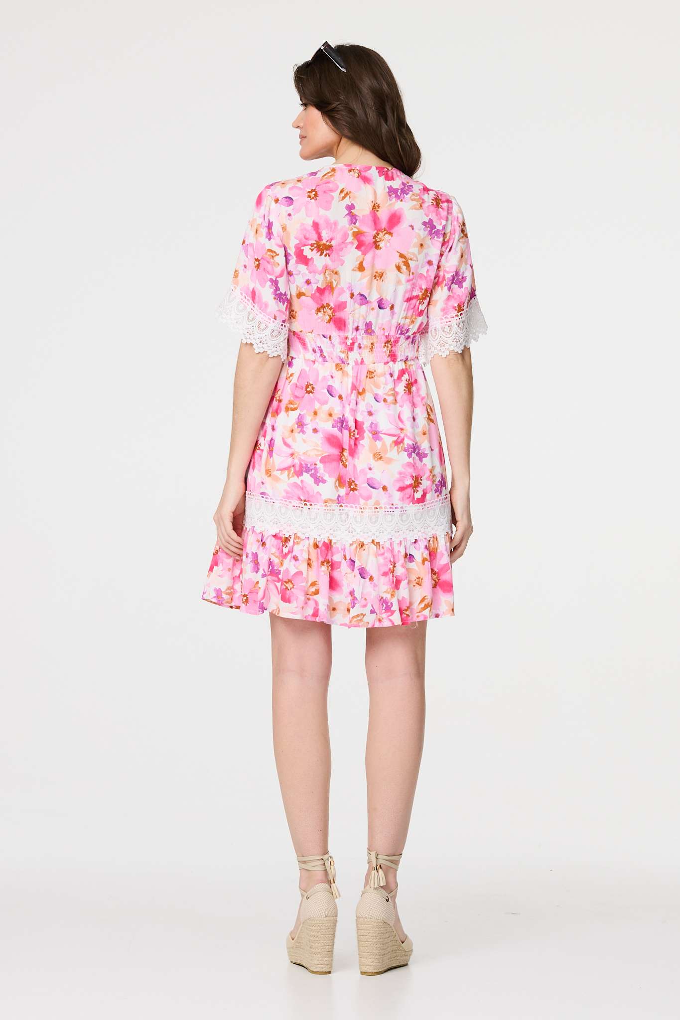 Look effortlessly stylish this summer wearing this floral dress. It has beautiful lace panels around the neck and sleeves, with a flattering empire waist. It's also made from 100% viscose for a comfortable and cool fit, even on hot days. This dress comes complete with v-neck, 1/2 sleeves and a short length hem.