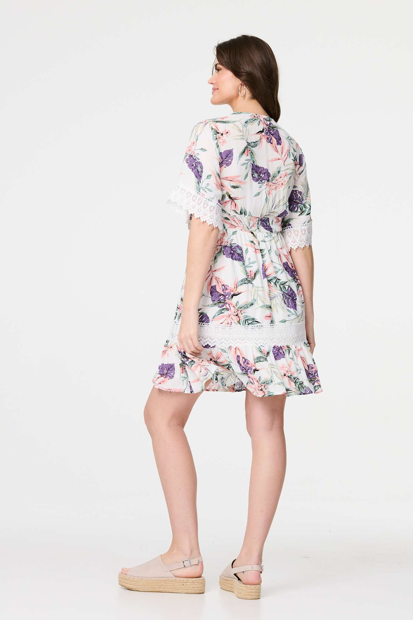 Leaf Print Lace Trim Short Dress