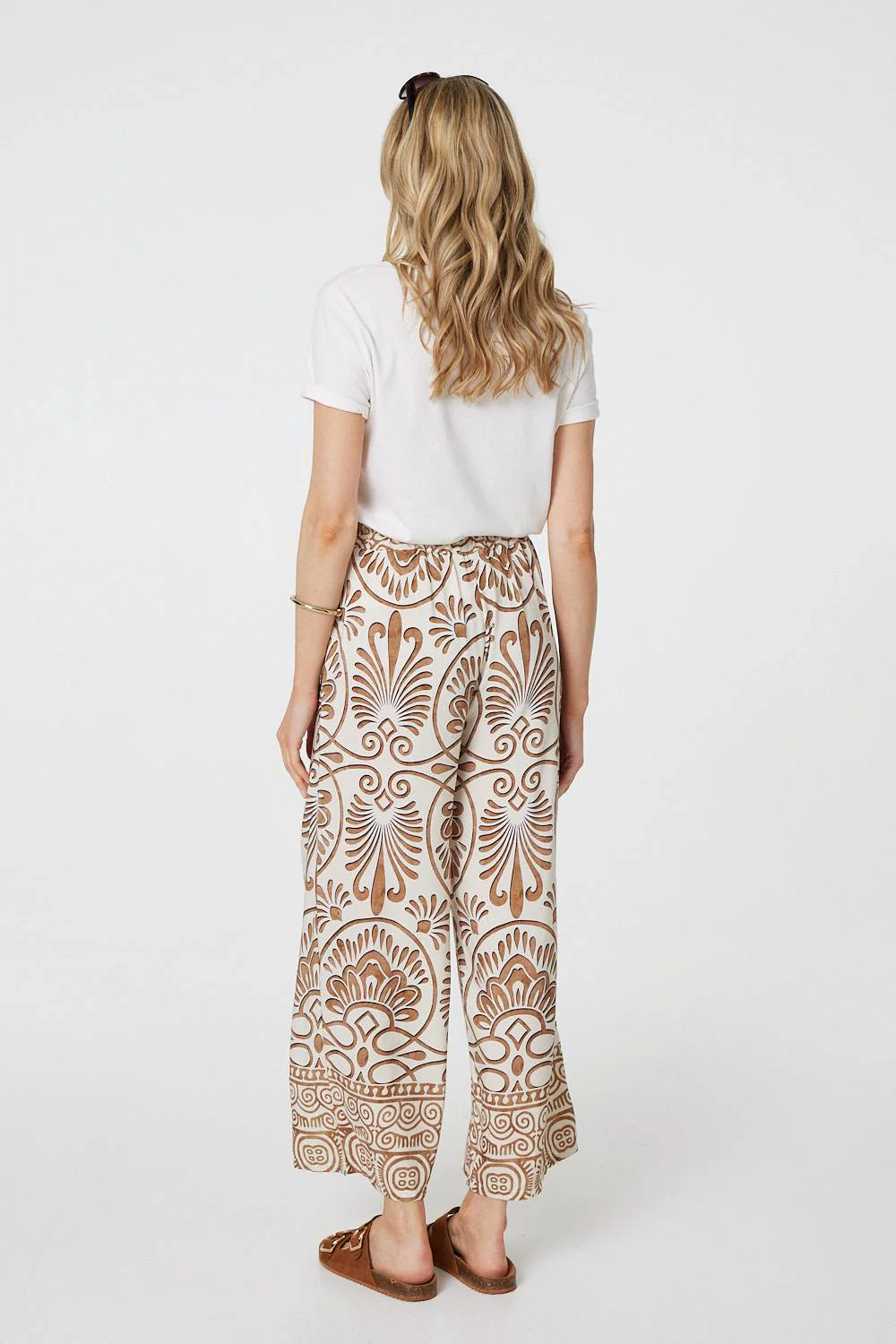 No closet is complete without a bold printed trouser like this wide leg style. With a high rise elasticated waist, a drawstring tie front, pockets and a full length wide leg. Style with the matching button down shirt and flat sandals for a bold outfit or pair with a white t-shirt and trainers for a cool yet casual everyday look.
