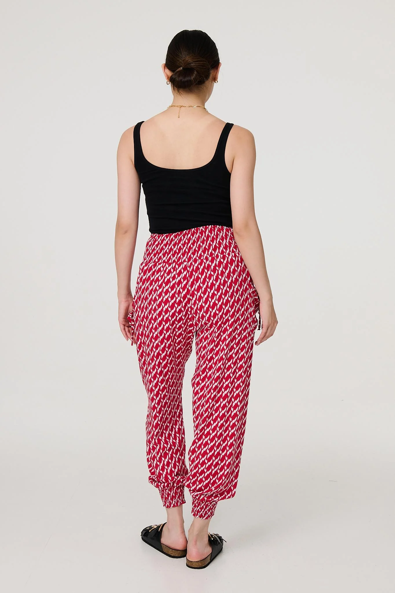 Add a fun printed trouser to your closet with this vibrant geo print harem trousers. With a soft elasticated waistband, side pockets and tapered ankle length legs with soft smocked detail cuffs. Style with a t-shirt and sliders for a comfortable daytime outfit.