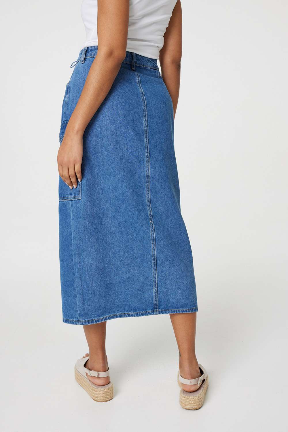 Get the ultimate laid-back look in this denim skirt. It has a midi length hem with a front split, as well as stylish pocket details. The high waist fit includes a stretchy elastic adjuster, meaning it will fit your waist perfectly. This skirt will look great with a top or jumper tucked in - just add your favourite belt through the belt loops and complete the look trainers or sandals.