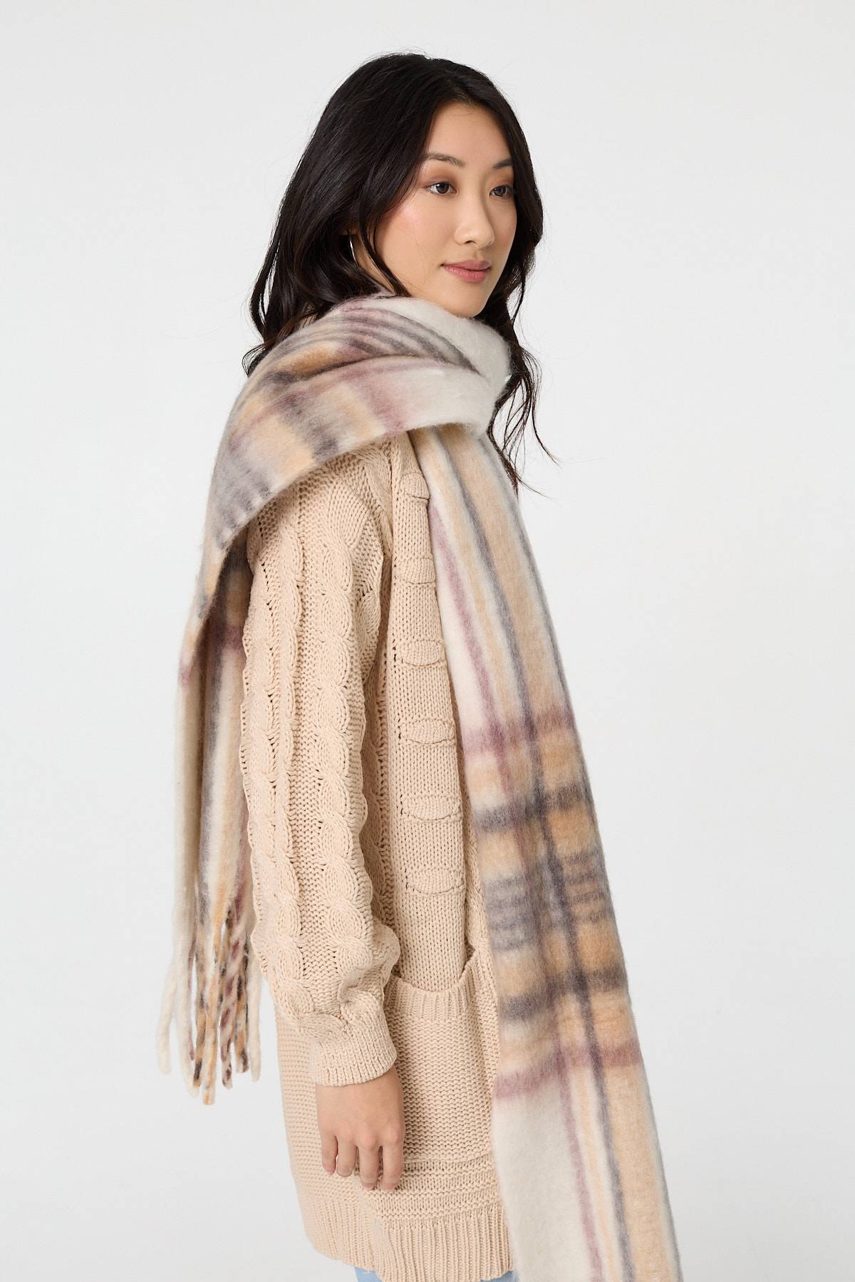 Checked Print Oversize Fringed Scarf