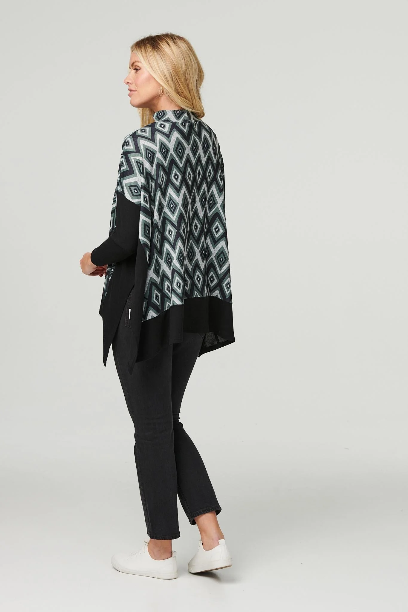 Add a statement print to your casual closet with this ikat patterned relaxed fit top. It has a high neck, 3/4 sleeves, side splits, an oversized fit and a thigh length hem. Team with jeans and trainers for an elevated off-duty look.