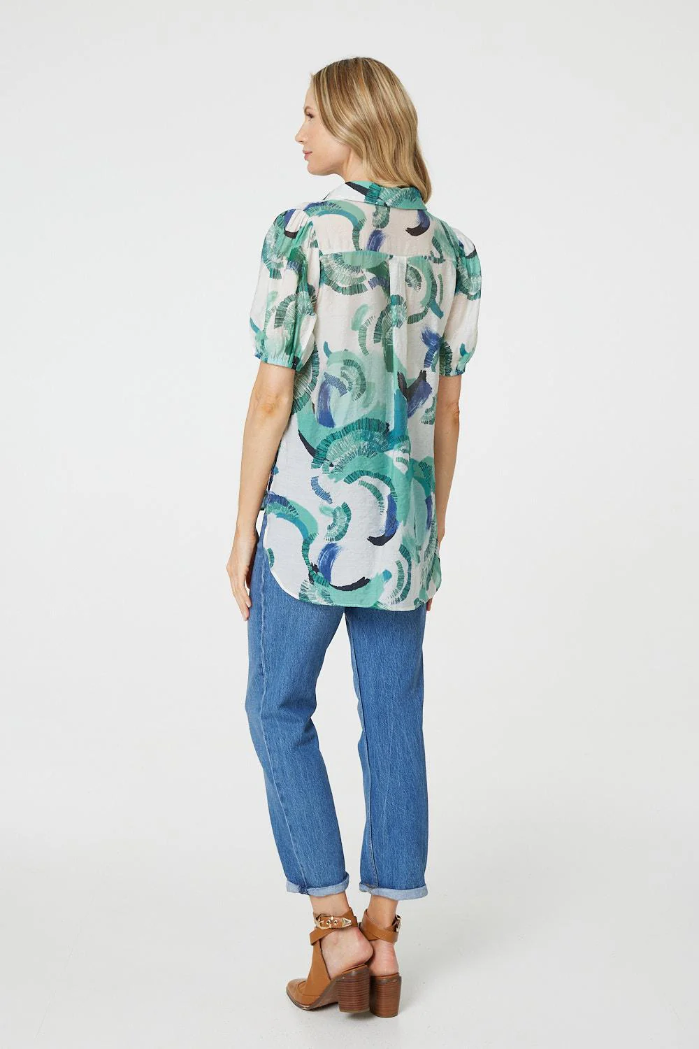 If you're headed to work or enjoying a laid-back day off, this blouse is your perfect choice. It has a comfortable v-neck with a collar and short puff sleeves, along with a relaxed fit. We love this blouse with some blue jeans, or you can elevate the look with smart trousers and heels for a more formal look.