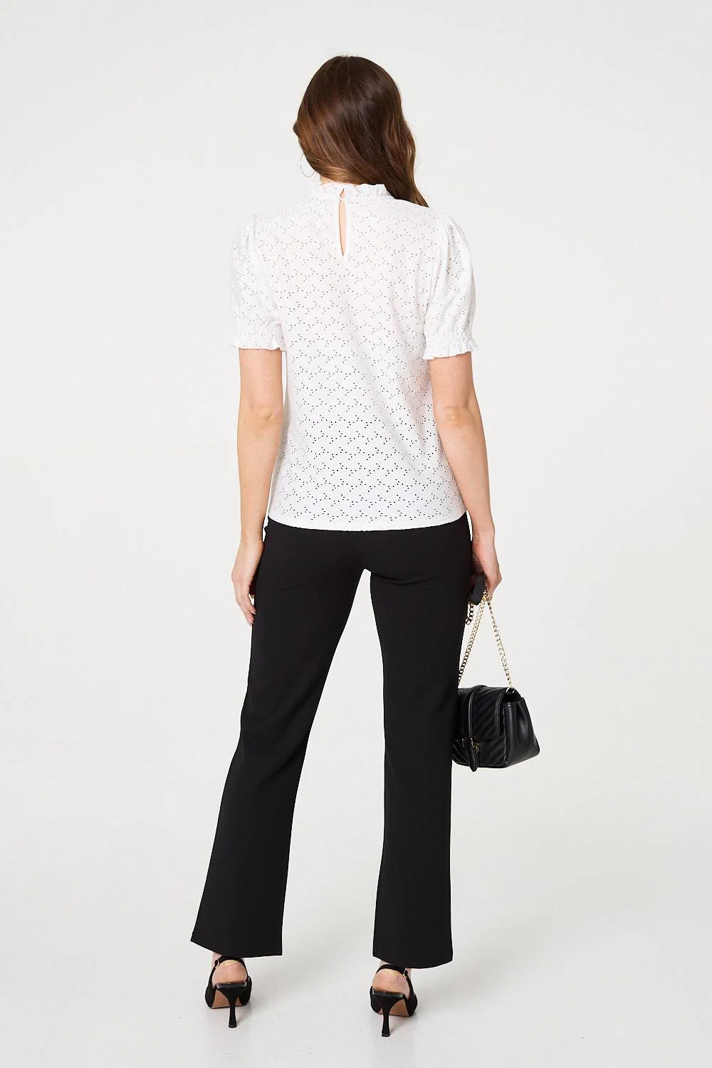 This beautiful blouse has a frilled high neck with a keyhole cut-out on the reverse. It has a slim fit with a semi sheer lace texture, meaning it's perfect for smart casual outfits. It also has a hip length hem and short puff sleeves. Wear it with trousers and your favourite heels, or go for a casual look with blue jeans instead.