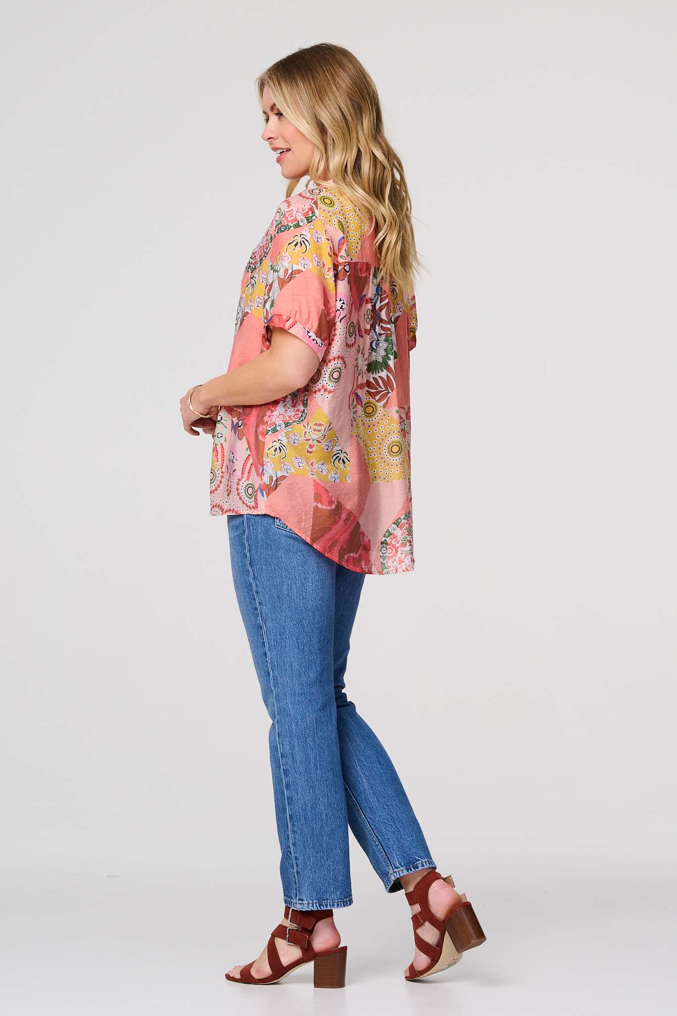 Go for a laid-back summertime look with this patchwork print blouse. It's made from a breathable cotton and viscose blend and features a v-neck, 1/2 sleeves and button details. It also has a curved hip length hem and looks stylish paired with blue jeans and sandals.
