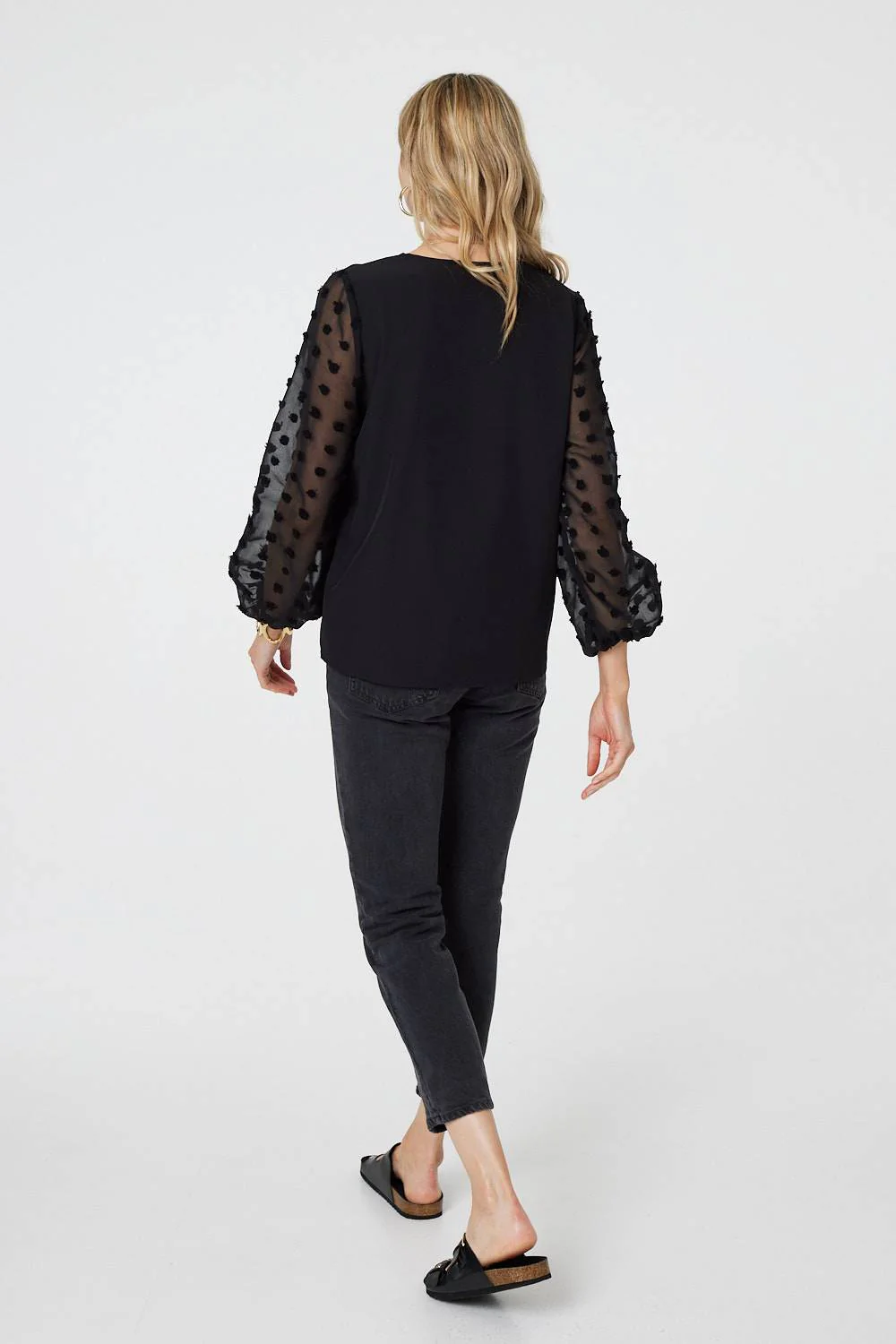 This blouse is perfect for formal occasions. It has a relaxed, flattering fit with a v-neck and a hip length hem. The long puff sleeves are made from a semi sheer material with polka dot details to give an effortlessly put-together look. Wear this blouse with fitted trousers or a skirt for a smart-casual event.